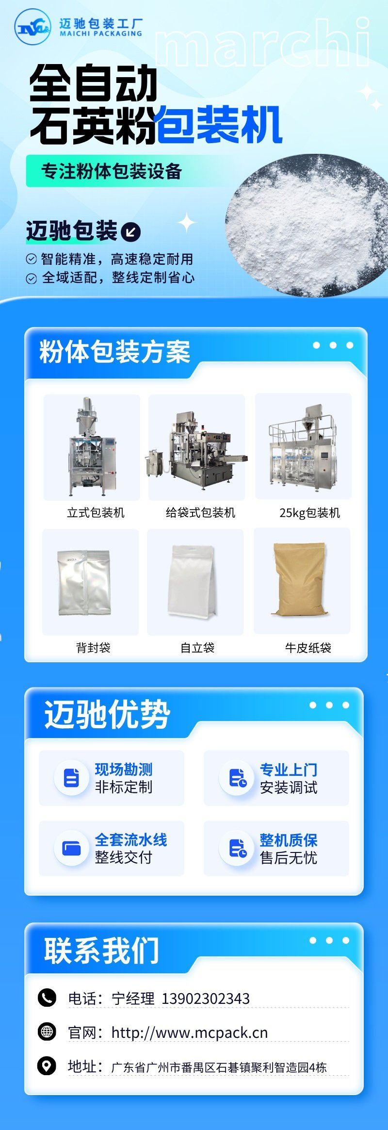 作为国内自动化包装设备领域的实力厂家,广州迈驰包装设备有限公司与合肥迈驰包装设备有限公司在全国范围内(涵盖东北、华北、华东、华中、华南、西北、西南各省市及县级区域)为石英粉行业客户提供设备选型、非标定制、调试培训、终身运维等一站式服务。
